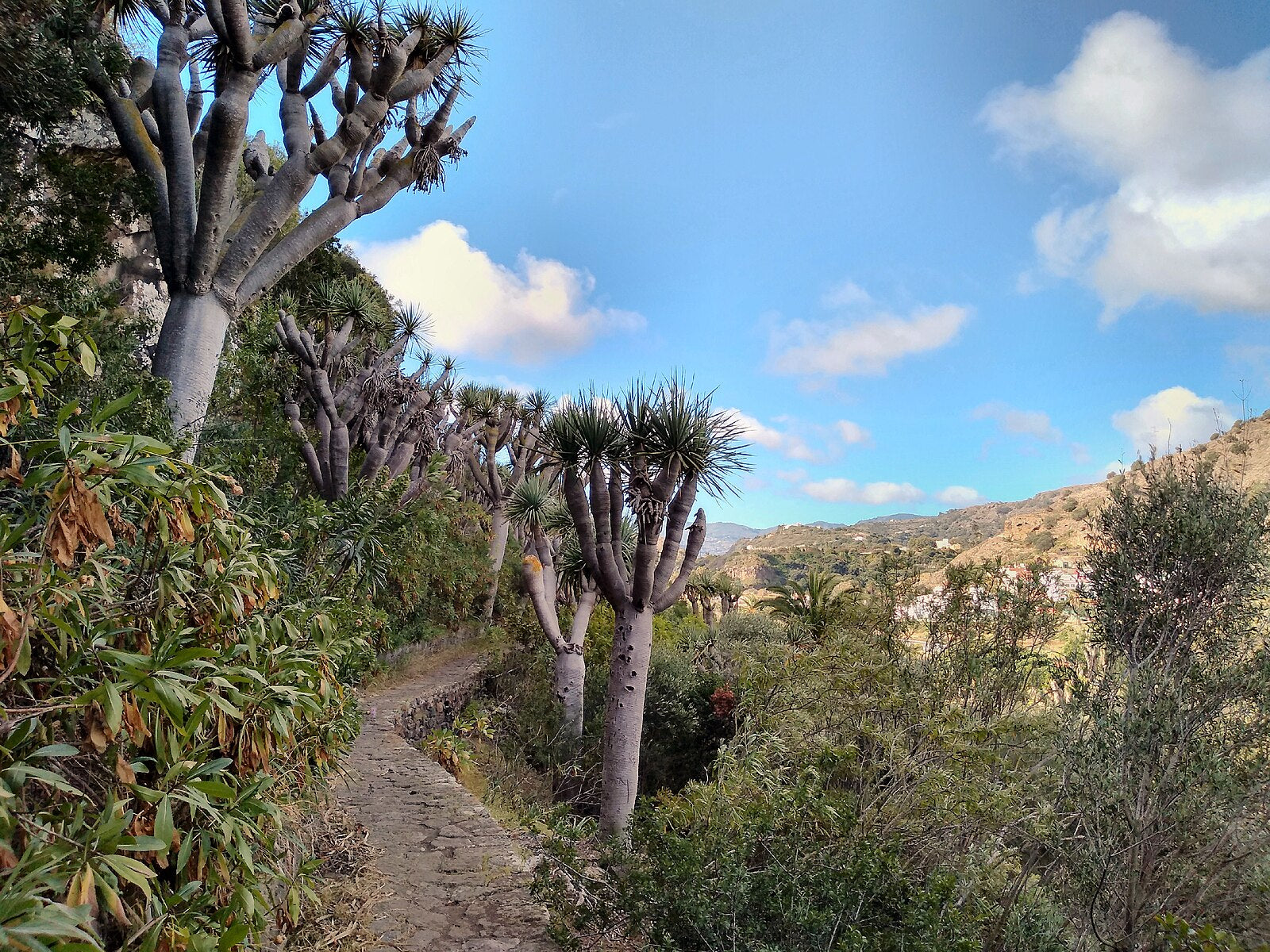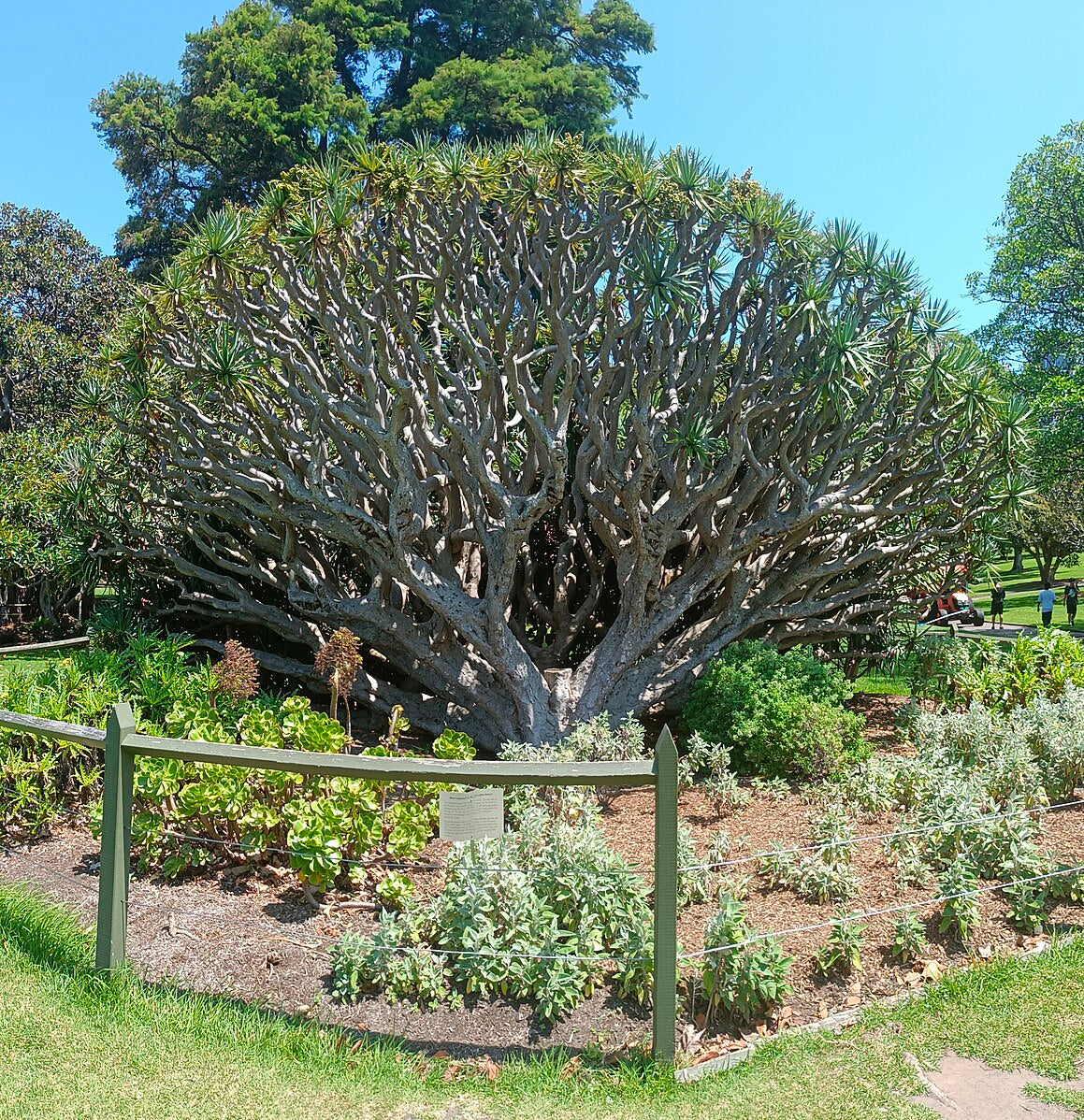 This species, Dracaena draco, which not only is native to the Canary Islands, but also Cape Verde (Cabo Verde), Madeira, and a few places in western Morocco, is usually called the Canary Islands dragon tree or dragon's blood tree, or just drago. Early Portuguese introductions from Cabo Verde are believed to have given rise to the small population that still exists in the Azores as well. When the Swedish father of taxonomy, Carl Linnaeus, described the tree in 1762, he called it Asparagus draco — and indeed it is still placed in the Asparagaceae family. But this tree is no simple asparagus. It has a very distinctive growth form: young trees grow upward as a single stem topped by a dense crown of long, yucca-like leaves; then after ten years or so, the first pretty white flowers form (looking somewhat like lilies), followed by orange-red fruits; then a crown of buds forms and the plant begins to branch; each branch grows for another decade or so, then also flowers and branches again, in a process repeated over hundreds or thousands of years until the tree has a large, strong, woody trunk, topped with a maze-like crown of interlocking branches topped with a hemispherical crown of green leaves, flowers, and fruit. The oldest, largest individuals are stunning to see.