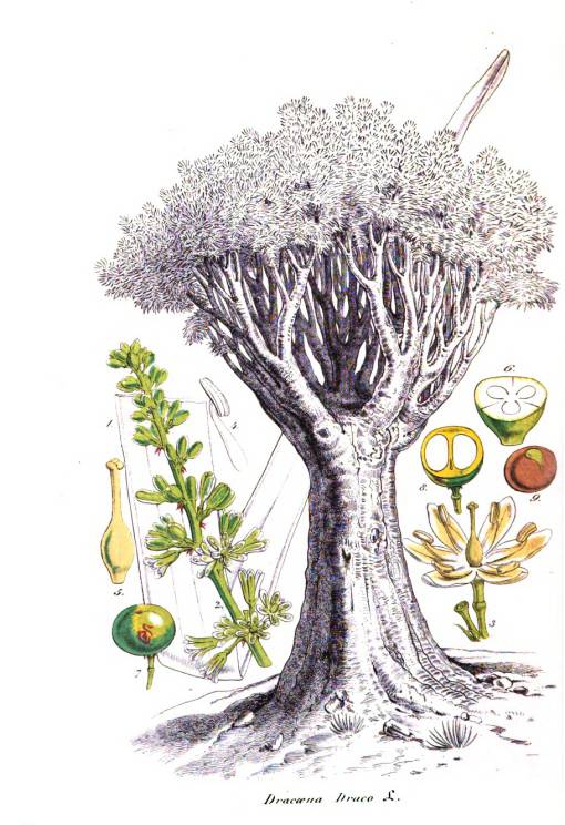 NOTE: The image of the old tree with the door in its trunk, comes from the Wellcome Collection, a website operated by Wellcome Trust, a global charitable foundation based in the United Kingdom. It is shared under the Creative Commons Attribution 4.0 International license. The image of dragon's blood resin may or may not come from this species, but all of the resins look similar (it may be Dracaena cinnabari, as the author believed, or Calamus draco, an unrelated species which produces a similar-looking resin, or Dracaena draco). It is from author Maša Sinreih in Valentina Vivod and is shared under the Creative Commons Attribution-Share Alike 3.0 Unported license. All others are public domain images of Dracaena draco.