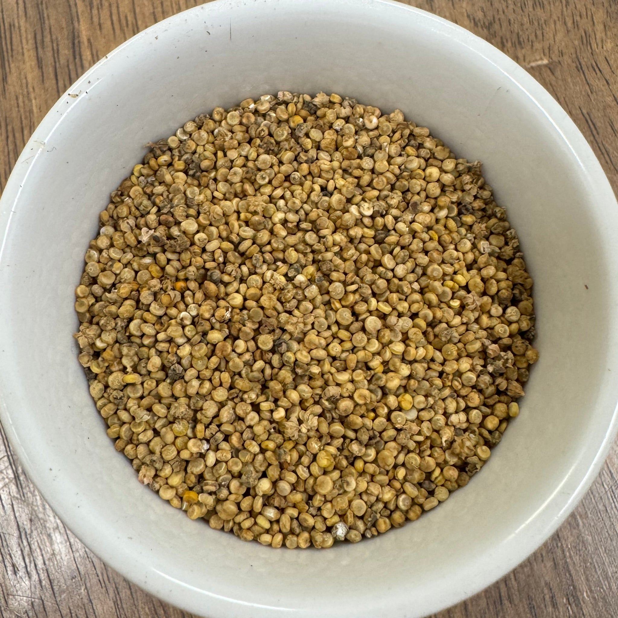 Developed in Norway, 'Stephe' is a tan-seeded quinoa with yellow flower heads, well-adapted to northern climates with their short seasons and shifting day-lengths (which is not at all typical for quinoa). Our seed was grown by our friend Aaron Parker, of Edgewood Nursery in Maine, which is not a place one would expect quinoa to grow, so you know this is a special variety. Like all quinoas, the plant will resemble the familiar weed lamb's quarters (both are in the Chenopodium genus) and also have edible leaves and stems. The seeds should be washed to rinse off saponins before cooking and eating.