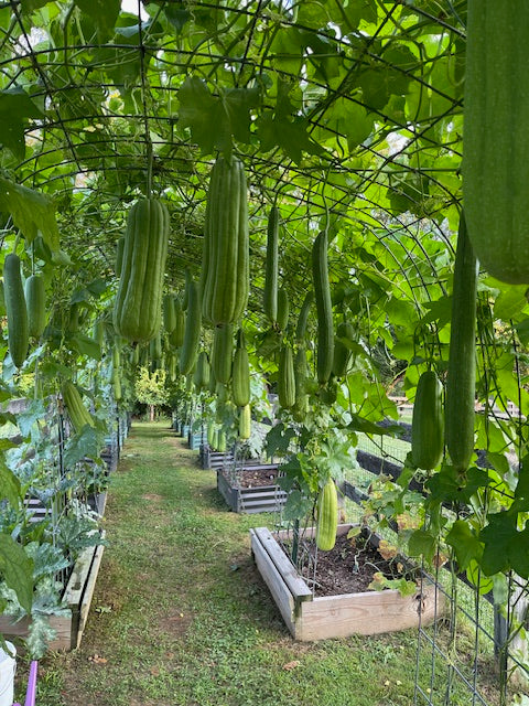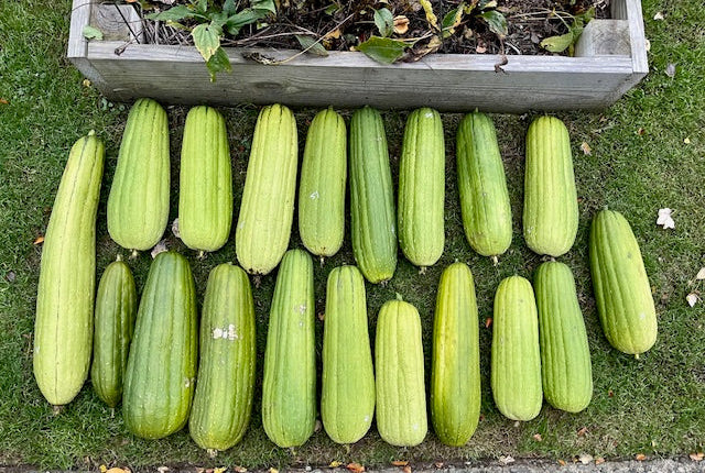 This exciting luffah breeding mix comes our way from Meika Laszlo, of Wall Township, New Jersey, a master gardener, skincare formulator, soap maker, mother, and retired special ed teacher, who started growing luffa over a decade ago — and ended up pretty obsessed (her word!). That first luffah was a generic "dishrag" type, sold by a seed-company-who-shall-not-be-named. Meika takes over the story from here: