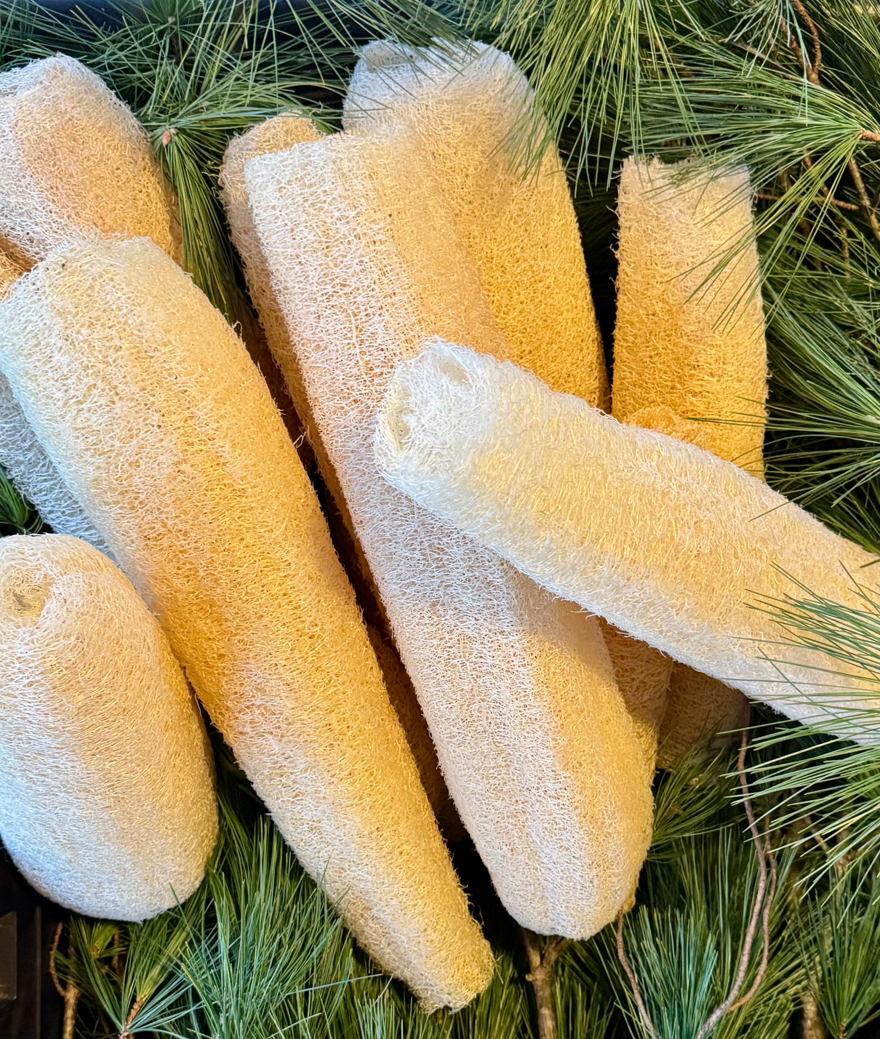 Although I don’t love the name, the seeds that have resulted in this work have become known in my house as “Jersey Giants”, but the variety is really too diverse to get a cultivar name yet. You will get a variety of 3 or 4 different-looking fruits, all with different types of fiber (which is the exciting part of this mix for me). The size and fiber content range from an extremely dense and heavy sponge, great for so many uses (exfoliating feet, scrubbing pots and pans, cleaning grimy leather, etc), to far more soft and airy sponges, delicate enough for exfoliating facial skin. Plus lots of types in between those extremes. When full-grown, sponges can reach 36” long and 15 to 20” in circumference, though most are smaller than that."
