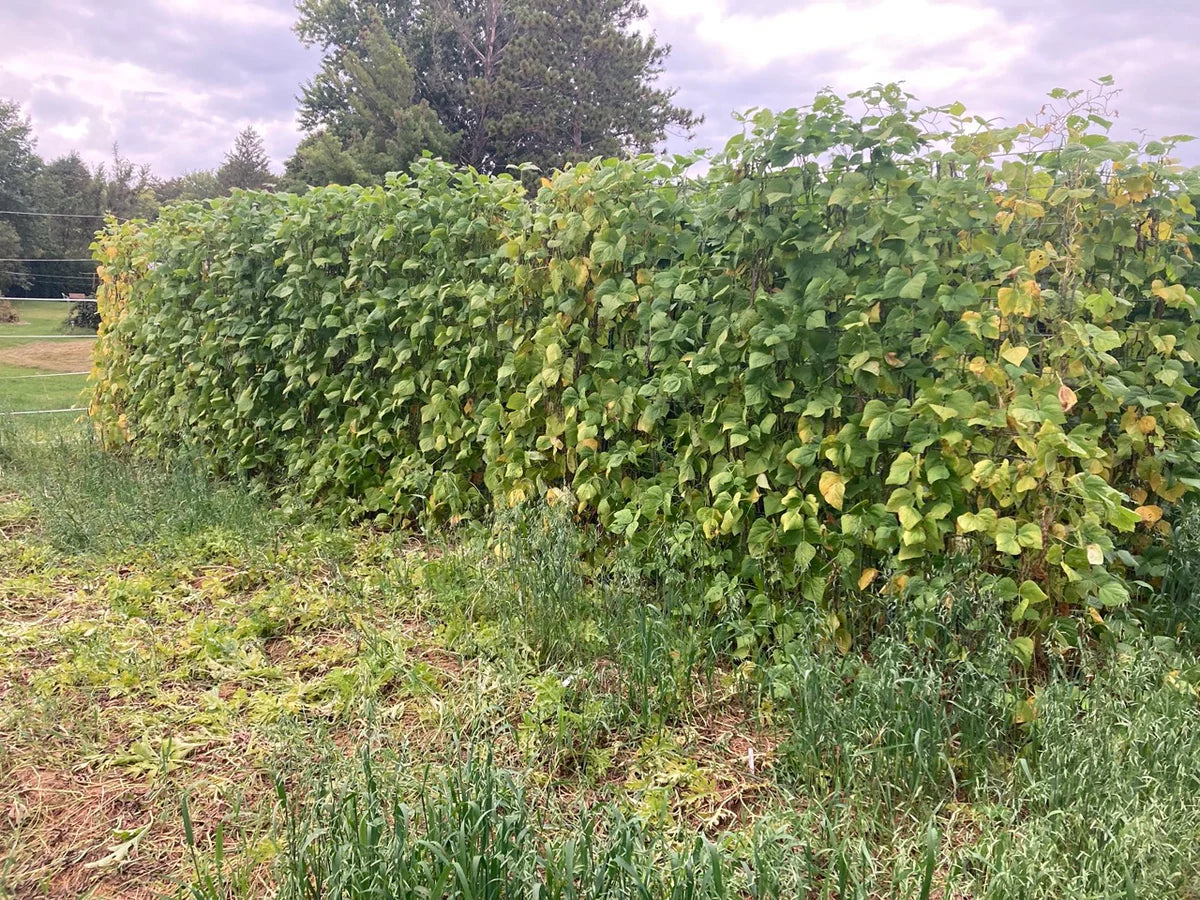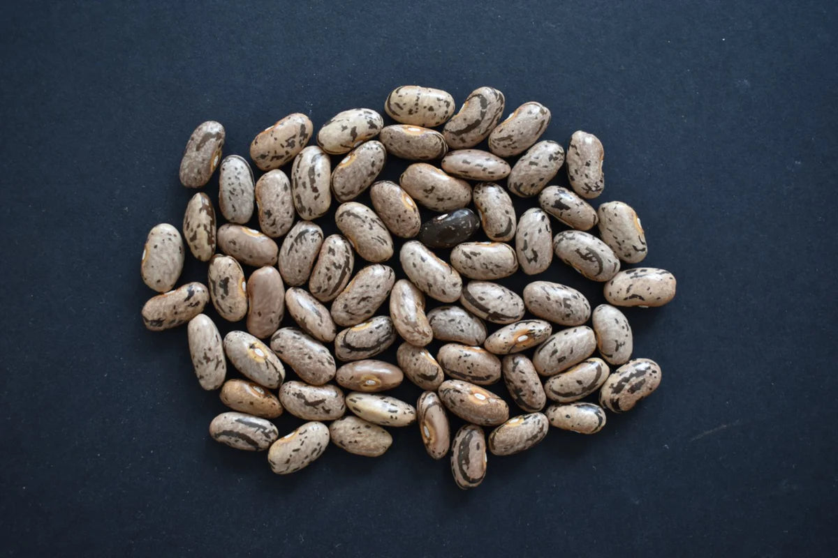 'Rattlesnake' bean is a lovely purple-striped romano-type green-bean, commonly eaten fresh, cooked, or pickled. The pretty seeds can also be used fresh as shelly beans or later as dry beans. The precise origins of this variety seem to be lost to history, but it is a widespread type of Indigenous pole bean with a history of use among at least Pueblo, Cherokee, & Haudenosaunee peoples, based on our research, and no doubt many others (given the distance between the homelands of each of those peoples). If you're familiar with the Italian 'Borlotti' bean, you can use dried or fresh 'Rattlesnake' beans for all of the same purposes, but you can also use the pods like any romano-type flat green-bean.