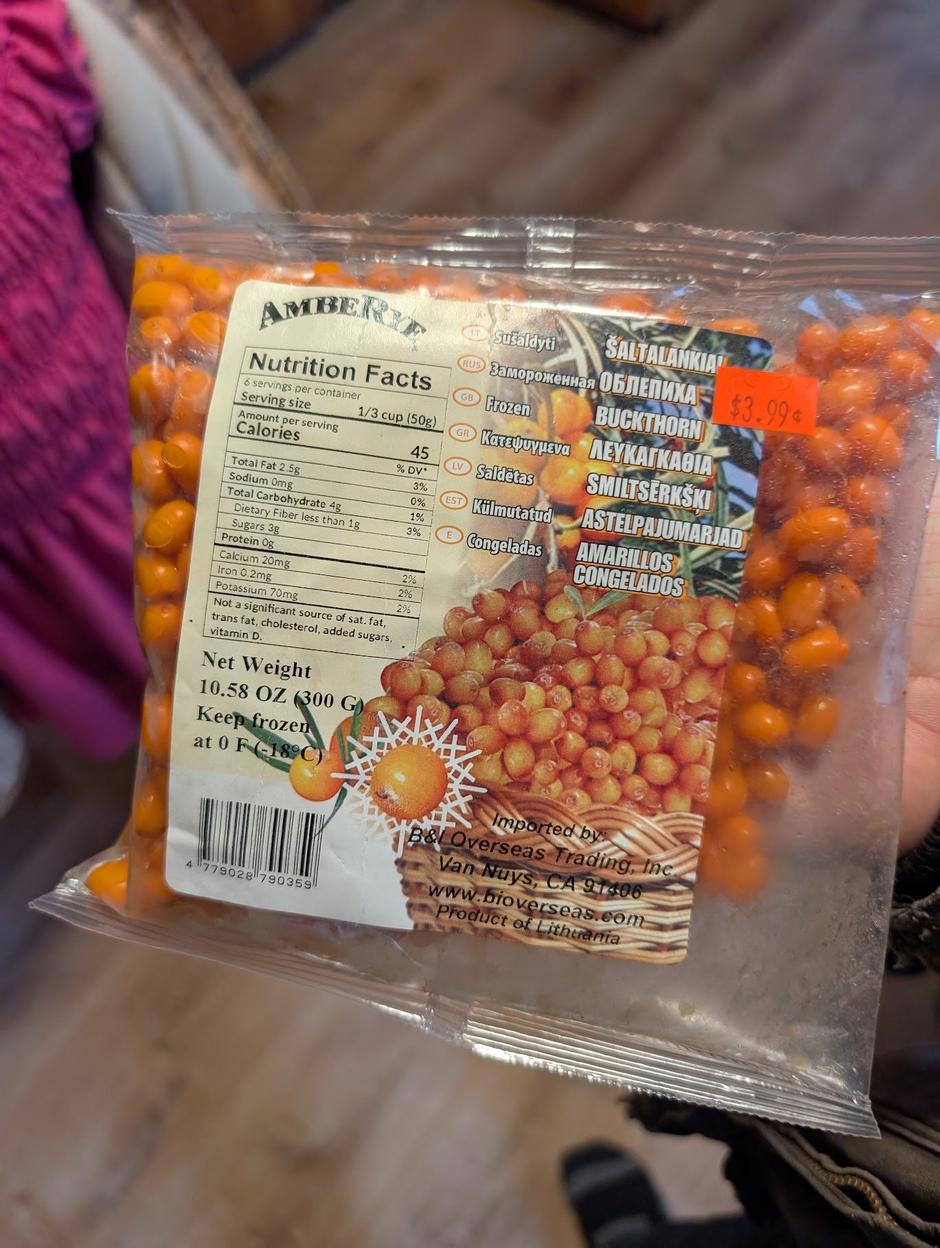 These seeds come from fresh frozen sea buckthorn fruit imported from Lithuania by Eastern European grocers in Northeast Philadelphia. We don't know if these came from a named cultivar, or which subspecies they represent, but we can surmise that they are highly productive plants since they're being grown on a large enough commercial scale to warrant glossy packaging and export across an ocean. The fruit that produced these Lithuanian seeds was particularly large and sweet, excellent for jam and jelly.