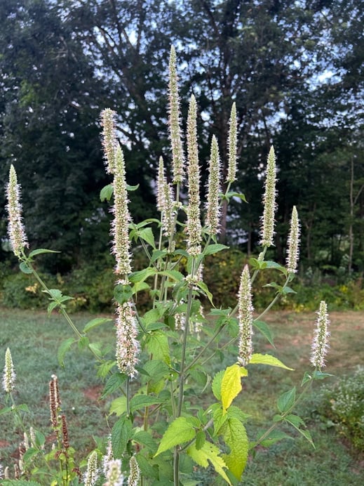 One of our tallest herbaceous perennial species, native to the central and eastern United States and Ontario, purple giant hyssop easily lives up to its name, growing up to nine feet tall each year. It has a very striking look, with enormous flower spikes that are light lavender and bloom in late summer and early fall. Related to the delicious anise hyssop, but much taller and with only a very mild scent and flavor, some people like to use the young leaves in salad or the dried leaves in tea. It also has a history of medicinal use by Indigenous peoples, with its leaves used for respiratory issues, fevers, as a digestive aid, and a diuretic, and its roots used for coughs and wounds. It is said to a have a mild calming effect for the nervous system as well.