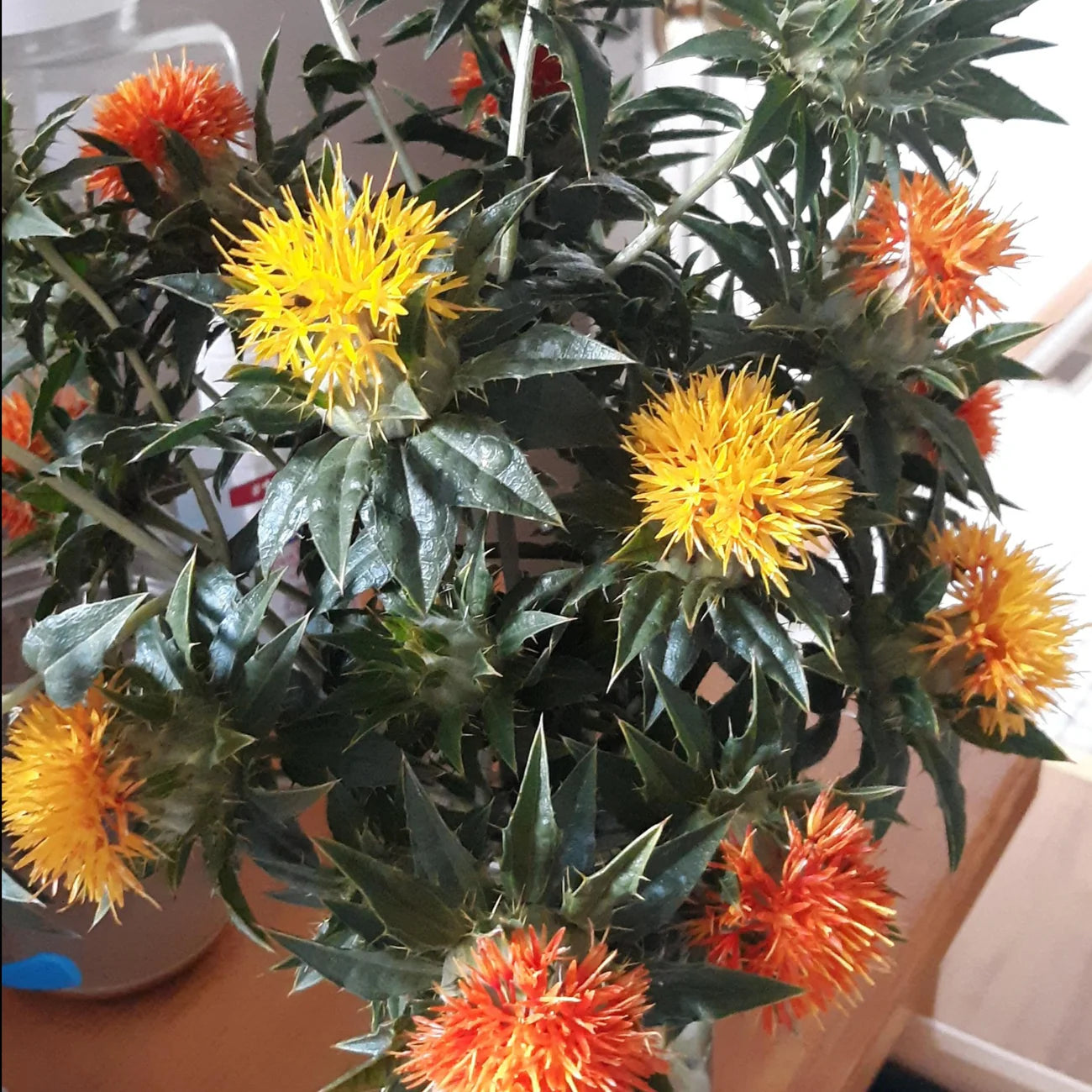 GROWING TIPS: Safflower is best direct-seeded after soil warms up in spring, but you can start it in flats too, a couple weeks before last frost. Plants grow to one or two feet tall, and often need support once they begin to bloom (a Florida-weave works well if you're growing in rows; a patch of plants might not need much support, as they'll sort of support each other). Plants are quite prickly, so handle with gloves when processing for seed.