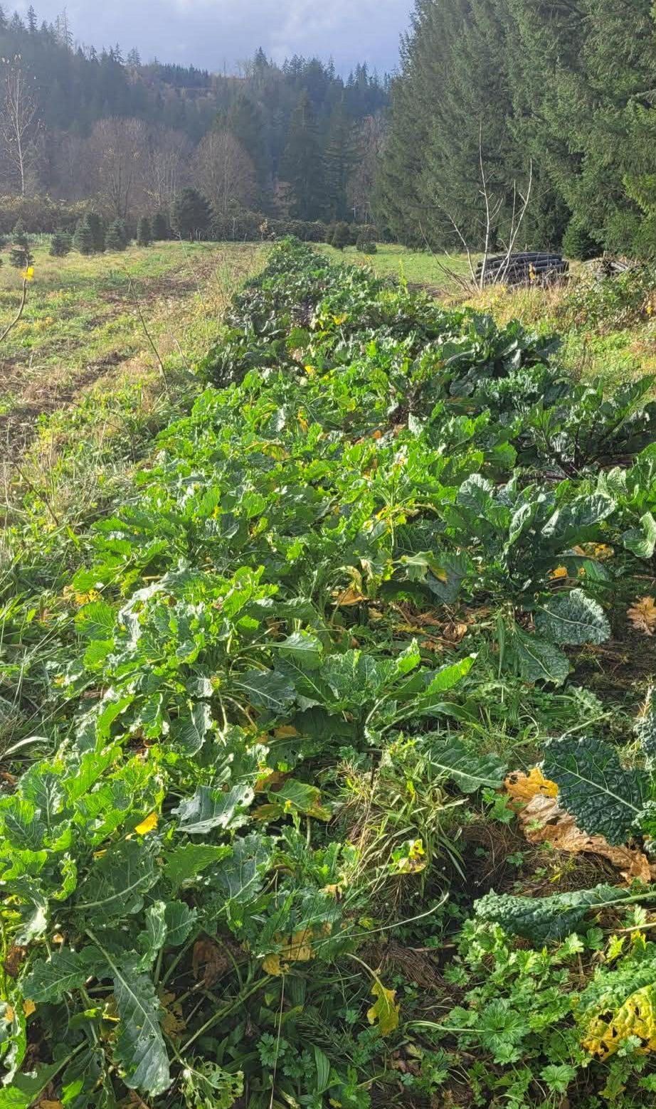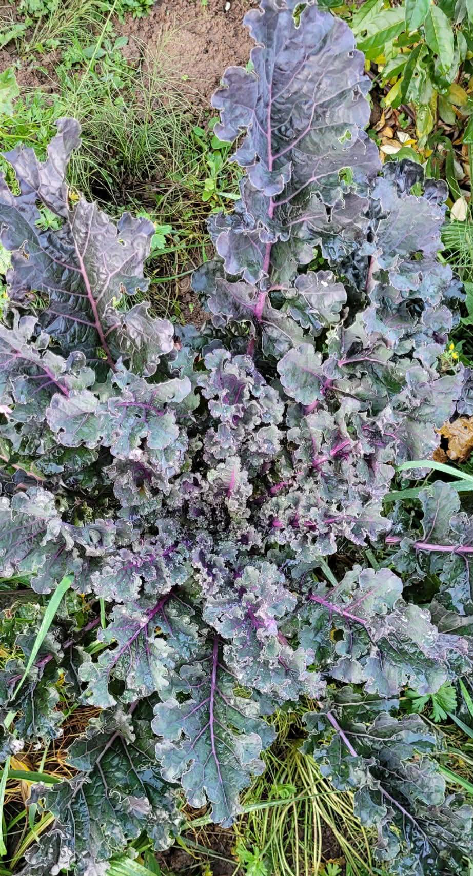 This iteration incorporates all the very best clones from my breeding work dating back to 2012, with the bulk deriving from 2017 onward. These were crossed among themselves and backcrossed to ‘Purple Tree Collards’, improved ‘Daubenton’ forms, Gullah Geechee perennial collards, perennial glazed collard selections, as well as superior seedlings selected for cold hardiness, cell-crowding survival, and heat/drought resistance. Seedlots were produced from interbred, isolated selections in nurseries featuring my top clones from 2018–2023. Additional seeds came from the very best plants in my 2023 field selection, which underwent similar selection pressures. These seedlings were subjected to crowding conditions with approximately 15 plants per cell and progressively thinned to the most resilient survivors. Plants in these cells then endured water and heat stress over several months and were further thinned. I use a special custom seedling soil mix designed to provide all necessary macro- and micronutrients for growing micro-plants in a 72-count tray. The seedlings were overwintered and exposed to single-digit temperatures multiple times. In spring, they were further thinned and fertilized with liquid organic fertilizer. Around 5% flowered under these conditions and were culled. The best surviving seedlings were transplanted to 4-inch pots and grown in the greenhouse. In June, they were field-transplanted and watered in (some pots still contained multiple seedlings at this stage). After the initial watering, the plants received just one more irrigation during a prolonged drought that season, then were dry-farmed thereafter. Most established and thrived, with stragglers typically being rogued.